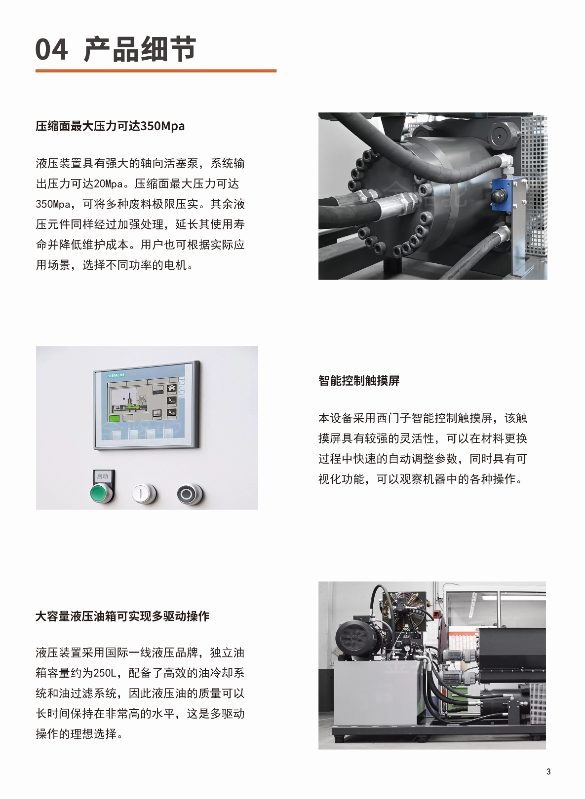 設(shè)備液壓裝置強(qiáng)大軸向活塞泵輸出系統(tǒng)壓力可達(dá)20Mpa,最大壓縮面壓力可達(dá)500Mpa,通過矩陣技術(shù),機(jī)器可以更好的將松散的碎屑、灰塵或切碎的材料進(jìn)行極限壓實(shí);壓實(shí)不使用任何粘合劑,僅使用液壓壓力;該設(shè)備所產(chǎn)出的廢料塊尺寸統(tǒng)一、密度高,易于堆疊運(yùn)輸。