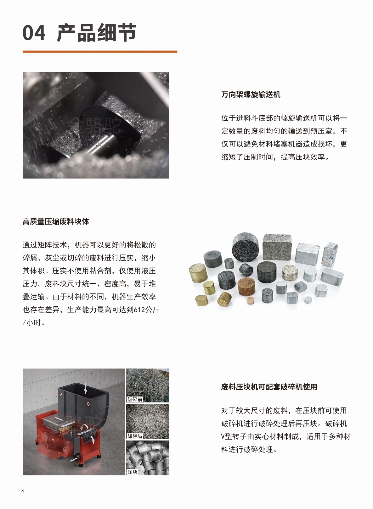 1、將廢料壓制成塊,有效減少儲(chǔ)存所占空間及顯著提高轉(zhuǎn)售價(jià)值;